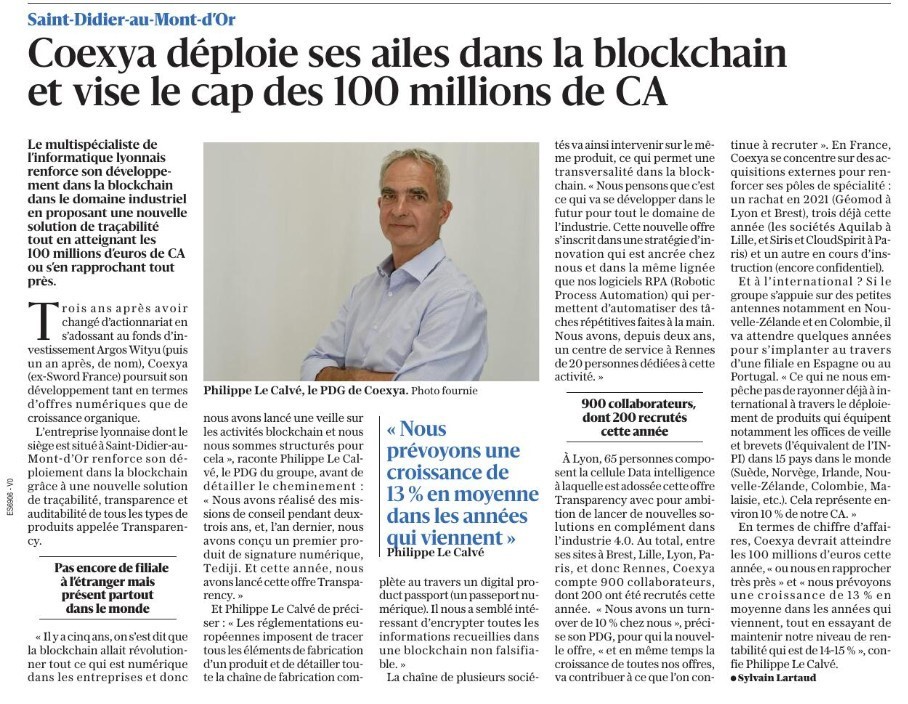A l'occasion d'une ITW dans le journal Le Progrès, Philippe Le Calvé, Président de Coexya, revient sur les solutions développées par le groupe autour de la Blockchain, dont l'offre Tediji.